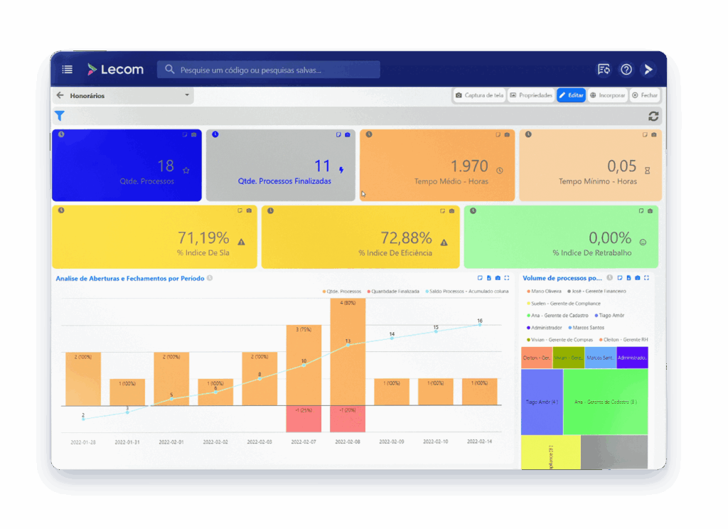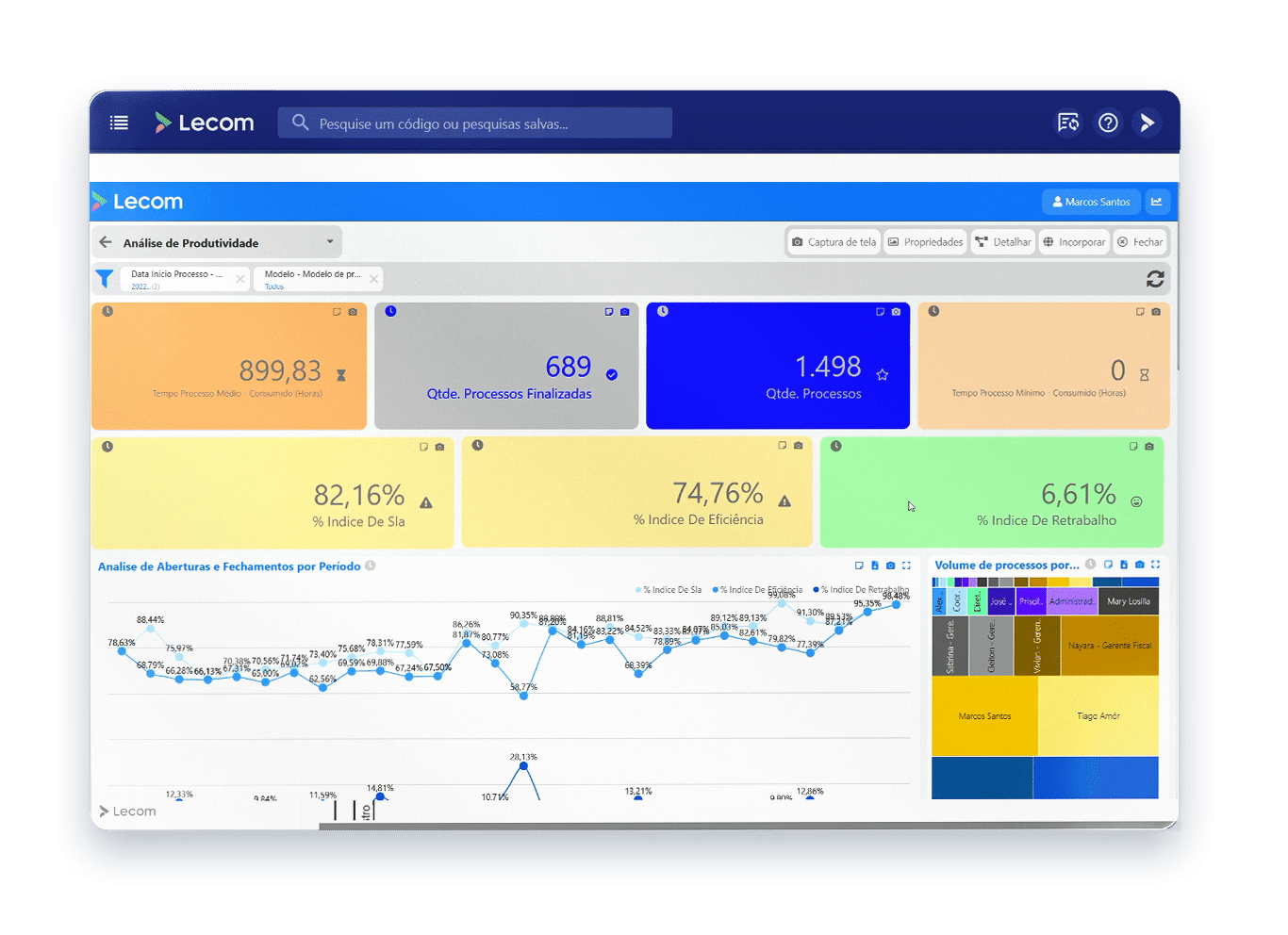 Com poucos cliques, você acessa análises de produtividade, estatísticas de processo, gestão operacional e muito mais. Deixe o tempo de construção dos dados para trás e foque no que realmente importa: analisar e decidir.